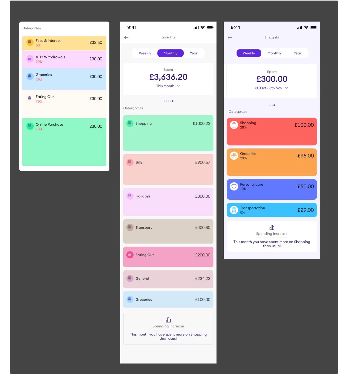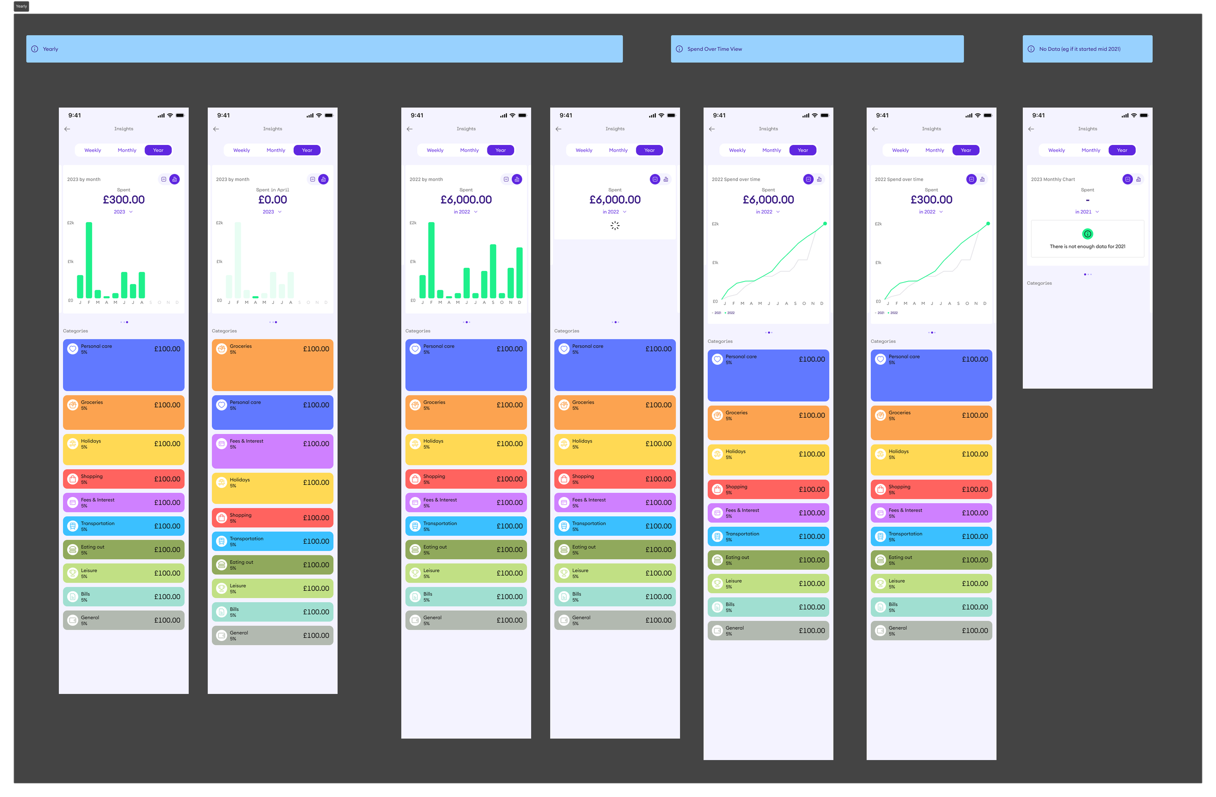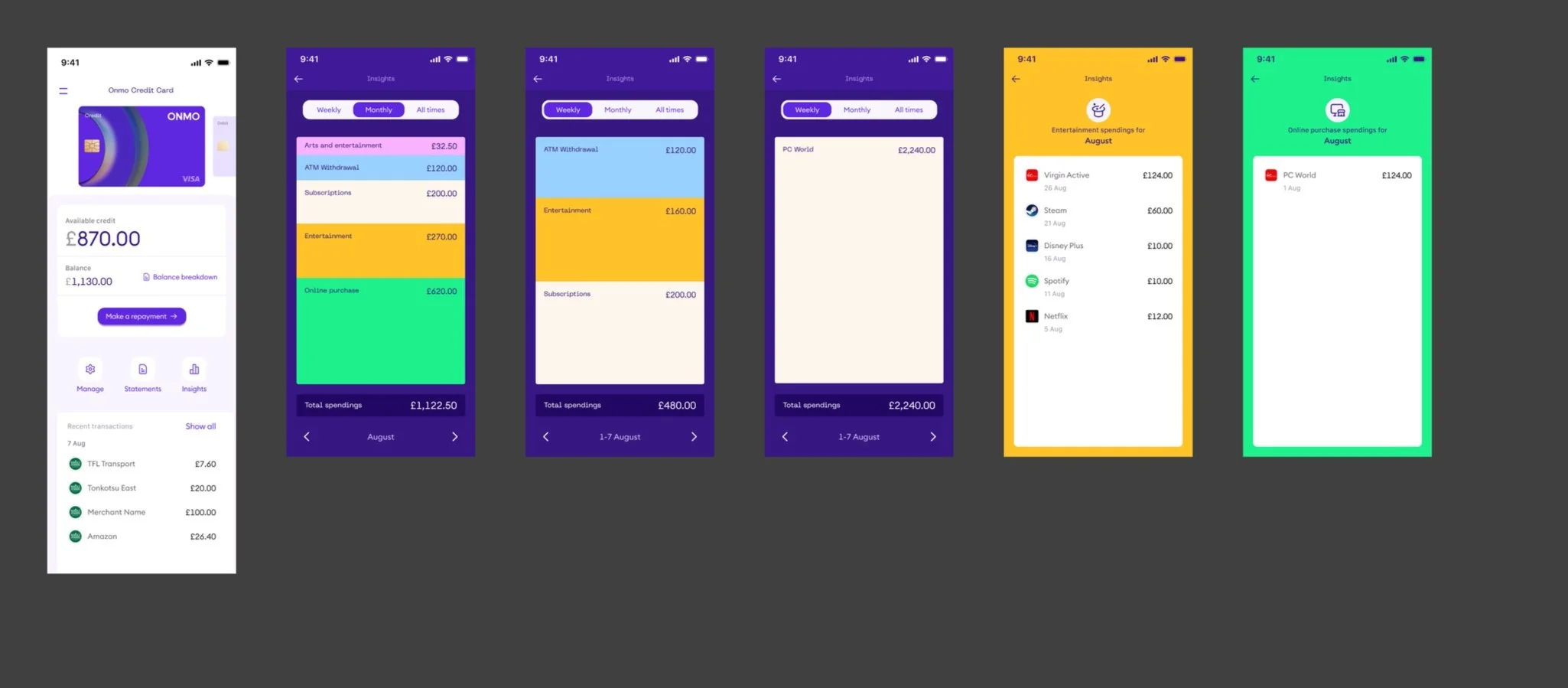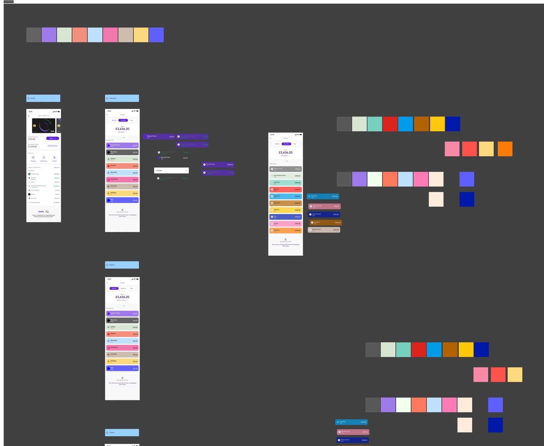 We aimed to enhance the Insights feature on the new Onmo app to provide users with more valuable and actionable financial information. While the initial concept received positive feedback, it needed to align better with our new branding and include additional features like yearly spending and financial recommendations.