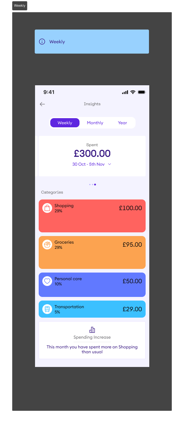 The redesigned Insights feature on the Onmo app is now more aligned with our branding and provides users with a comprehensive, user-friendly tool to monitor and manage their finances effectively. The Insights feature is set to be handed over to developers for careful evaluation and will be included in the second release of our new app.